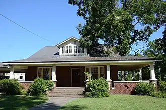 The Green Booth House is a historic house at South Pecan Street and West Center Avenue in Searcy, Arkansas. It is a single-story brick structure, with a broad gabled roof, and a wraparound front porch that extends to a carport on the left. A gabled dormer projects from the center of the front roof slope, and the porch is supported by tapered columns set on brick piers. Built c. 1925, the house is a fine example of the area's second phase of Craftsman architecture.[2]