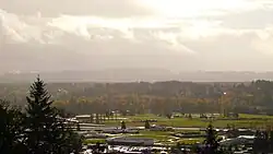 Despite being a place of incarcerated individuals, the training school initially did not have any fencing or attentive security, allowing students to escape with some ease until the 1970s.[5] Building a security fence became of importance in the late 1950s and early 1960s due to a larger amount of escapes and subsequent increases in crime, particularly auto theft and property damage, caused by the runaways.[10] Attempts to fund and build a security fence were undertaken in 1963. Considered unnecessary by the superintendent of Green Hill at the time, large settlements paid out by the state due to the escapee damages had surpassed the cost of constructing a fence.[11] Though it passed the state Senate, it failed to pass the House by the session deadline.[12][13] With the negative attention on escapes and runaway crimes,[14] the facility, by way of the student council, undertook a public relations tour in Chehalis and Centralia during the early 1970s. Students volunteered on various projects in the Twin Cities, including clearing land during the early stages of the creation of Stan Hedwall Park, repairing damages due to floods at the Southwest Washington Fairgrounds, and assisting senior citizens in helping to maintain their yards and homes.[15]