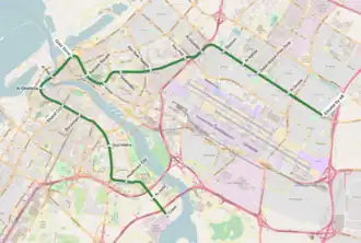 The Green Line is one of the two lines in the Dubai Metro network in Dubai, United Arab Emirates. It runs through Deira and Bur Dubai, generally parallel to Dubai Creek.[2] There are 20 stations on the line, spanning from Etisalat to Creek (numbered 11 to 30 in zones 5 and 6) covering 22.5 km (14.0 mi).[1] It was built by a consortium of Mitsubishi, Obayashi, Kajima and Yapı Merkezi.[3]