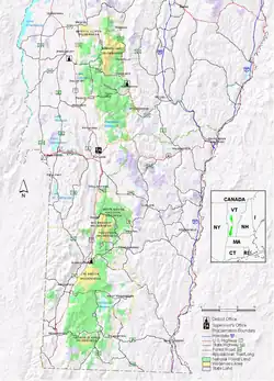 In descending order of land area, GMNF is located in parts of Bennington, Addison, Rutland, Windham, Windsor, and Washington counties.[1] The forest headquarters are in Mendon, Vermont, alongside those of Finger Lakes National Forest though that forest is in New York state.[4]