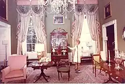 In 1961, First Lady Jacqueline Kennedy began a major refurbishment of the White House that included the Green Room. Her renovation was technically overseen by an advisory Committee on Fine Arts made up of museum professionals as well as wealthy individuals interested in antiques.[8] American antiques autodidact Henry Francis du Pont (an expert in Federal furniture) led this committee.[9] Mrs. Kennedy also brought in French interior designer Stéphane Boudin (an advocate of French interior design) and his company, Maison Jansen, to oversee the refurbishment.[10] Although du Pont and Boudin often competed with one another for control of redecoration of a space in the White House, the Green Room represents an area where they cooperated more closely.[4] This was because the Green Room had a long history as a Federal-style room, an area in which du Pont and his committee were experts.[6] The Green Room was the first room in the White House to be redesigned almost completely with the input of the committee.[4][a]