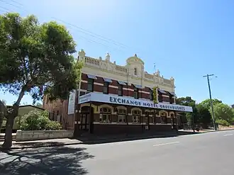 Greenbushes was founded as a mining town in 1888 following a surveyor's discovery of tin in 1886.[2] Greenbushes was named after the bright green Oxylobium lanceolatum that contrasted against the grey eucalyptus trees.[3] The railway from Donnybrook to Bridgetown opened in 1898, with Greenbushes station located approximately six kilometres north of the main townsite.[3] The area surrounding the railway station was renamed North Greenbushes to reduce confusion.[3]