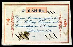In 1803, the Kongelige grønlandske Handel introduced notes in denominations of 12 and 24 skilling, 1⁄2 and 1 rigsdaler courant. The next year, the Handelsstederne i Grønland took over the issuance of paper money and introduced notes for 6 and 12 skilling, 1⁄4, 1⁄2, 1 and 5 rigsdaler courant.