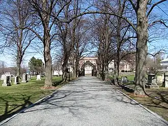 Nahant was originally settled as part of Lynn, and was largely agrarian until the mid-19th century, when summer resort development began to take place in its eastern half. The town was separated from Lynn in 1853, and the creation of a town cemetery was an early subject of discussion at town meetings. The oldest portion of Greenlawn Cemetery, a 2-acre (0.81 ha) parcel roughly encompassing the present cemetery's southern half, was acquired in 1856. A receiving tomb was built the same year, and the first burial took place in 1857. The Soldiers Memorial was dedicated in 1866 to the community's American Civil War dead. By 1918 further land acquisitions had given the cemetery most of its present configuration, and Ellingwood Chapel was built in 1920, to a design by the architectural firm of Cram and Ferguson. It was funded by Mary Johnson, in honor of her late husband's parents, Joseph Johnson, Jr. and Joanna Ellingwood Johnson.[2]