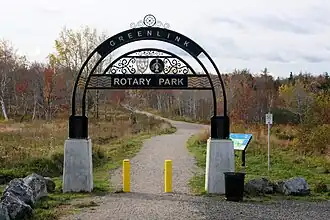By 2010, after lying dormant for a few years, planning for the Greenlink Park and trail system resumed.[14] Cape Breton Regional Municipality (CBRM) conducted public consultations, and by spring of 2012 work on developing the trail system was underway. While there had been an informal series of trails in Rotary Park, with some foot bridges and other amenities, these had generally fallen into disrepair. Earlier work by the CBRM to install municipal infrastructure that passed through Rotary Park, such as a new sewer for the then new Cape Breton Regional Hospital, and a new water main for the city's water supply, had resulted in repairs and improvements to existing trails and creation of new access roads and a new stream crossing.