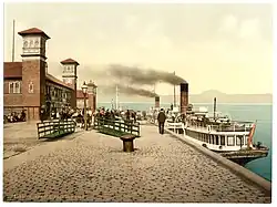 The station opened on 23 December 1869, as Greenock Albert Harbour.[1] The station was set on an embankment, with an open path leading down to Prince's Pier.[2] North British Railway through trains were advertised as running every week-day "between Edinburgh (Waverley and Haymarket Stations) and Greenock (Albert Harbour), carrying Passengers to and from Prince's Pier, Greenock, without change of Carriage, and thus placing them alongside the Clyde Steamers without walking through the streets."[4] The station was renamed as Greenock Princes Pier on 1 May 1875.[1] In 1877 the Glasgow and South Western Railway advertised that "Passengers are landed at the Prince's Pier Station, from whence there is a Covered Way to the Pier where the Steamers call, and Passengers Luggage is conveyed, free of charge, between the Stations and the Steamers."[5]
