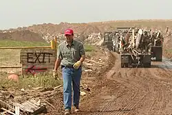 95% of structures within the city limits of Greensburg sustained some degree of tornado-related damage.[59] Around 800,000 cubic yards (610,000 m3) of tornado-related debris was removed from Greensburg in the aftermath of the tornado.[60] Initial recovery attempts in the days following the tornado were constrained by the disruption of electricity and by other hazardous conditions that made it difficult to clean up the town.[61] Then-President George W. Bush declared a disaster area in the state of Kansas.[62] Immediately after the tornado, the United States Environmental Protection Agency (EPA) dispatched on-scene coordinators to Greensburg; the agency was tasked with addressing fuel releases and mitigating damaged transformers.[63] The EPA left Greensburg in June 2007, a little over a month after the tornado, although it remained on standby.[64]