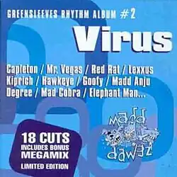 Greensleeves Rhythm Album #2: Virus is an album in Greensleeves Records' rhythm album series. It was released in March 2000 on CD and LP. The album features various artists recorded over the "Virus" riddim, produced by the Madd Dawgz production team of Mikey Williams, Tony Thomas, and Delon Reid. The riddim contains elements of the international hit Baby One More Time by Britney Spears. Virus riddim is a riddim.