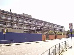 The hospital had its origins in St Alfege's Hospital in Greenwich which by the 1960s was in need of replacement.[1] In order to build a hospital with a large enough capacity for the requirements of the local population (up to 800 beds) on a small site (less than 8 acres), a single large building was designed - Pevsner described it as "an unusually large enterprise to be undertaken by the Department of Health and Social Security (chief architect: W. E. Tatton Brown)".[2] The new hospital was fully open by 1972,[1] and it also absorbed services previously provided at the Miller General Hospital in west Greenwich, which finally closed in 1974.[3]