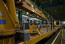 When it opened, the yard had a railway siding and some four rail, dual gauge (4 ft 10+7⁄8 in or 1,495 mm and 1,435 mm or 4 ft 8+1⁄2 in standard gauge) track for the delivery of subway cars from the manufacturer.[4] However, circa 2013, the TTC removed the standard gauge track to make more room for subway car storage.[7] As of 2016, the standard gauge siding had been severed from both the yard and the railway mainline.[8]