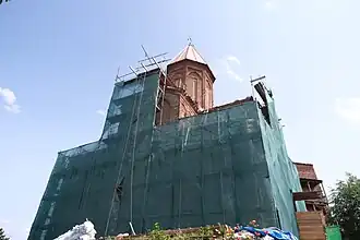 The Church of the Archangels was constructed at the behest of King Levan of Kakheti (r. 1520–1574) in 1565 and frescoed by 1577. It is a cruciform domed church built chiefly of stone. Its design marries traditional Georgian masonry with a local interpretation of the contemporary Iranian architectural taste.[1] The building has three entrances, one facing west, one facing to the south, and the third facing to the north. The interior is crowned with a dome supported by the corners of the sanctuary and two basic piers. The façade is divided into three arched sections. The dome sits on an arcaded drum which is punctured by eight windows.