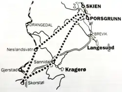 The next major proposal came with the 1991 plans to modernize the Sørlandet Line, and resulted in several more specific plans. A 1995 recommended that a Grenland Line be built at some point during the 2000s, following one of two paths. Both started at Skorstøl Station on the Sørlandet Line, and then either ran via Sannidal outside Kragerø (outer route) or via Neslandsvatn Station on the same line (inner route) to link inn on the Vestfold Line north of Porsgrunn Station. More detailed analyzes were carried out in the following years. The inner route was eventually recommended as it could be built in several steps, overshadowing the outer route's advantage of passing through the more population area of Vestmar. Local governments have however included the planning of the outer route in their municipal plans.[1] Railway Forum South was established in 1992 as a cooperation between the county municipalities of Rogaland, Vest-Agder, Aust-Agder, Telemark and Vestfold. The groups has been lobbying for a upgraded railway line along the entire coast from Oslo to Stavanger, which they call the Southwest Line, and has the Grenland Line as an important component.[1]