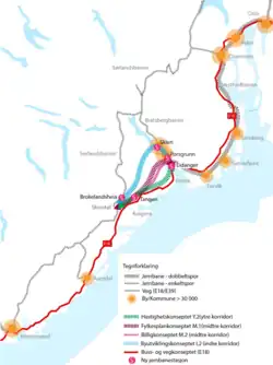 The 2016 concept selection study presented three possible main corridors for the Grenland Line. The southern-most would branch off from the Vestfold Line at Eidanger, where a new station would have to be built. Due to the new section of the Vestfold Line, regional trains would not be able to service this new station, located some 3 kilometers (2 mi) from the current station and town center of Porsgrunn. This route would cut south through southern Porsgrunn and Bamble, largely following the route of E18. The route could have a station serving Bamle at Rugtvedt. It would have an intermediate station at Sannidal/Tangen before intersecting with the Sørlandet Line at Skorstøl. This line would be 64 kilometers (40 mi) long, would cut travel time by 70 minutes and was estimated to cost 24.4 billion Norwegian kroner.[5]