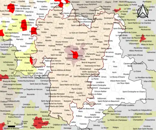 Grenoble metropolitan area (French: aire d'attraction de Grenoble) as defined by INSEE in 2020 is the functional urban area of the city of Grenoble, southeastern France. It covers 204 communes, all in the Isère department.[1] It has 714,799 inhabitants (2018) in an area of 2,876 km2 (1,110 sq mi), which is 39% of the Isère department.[2] Grenoble and 15 other communes form the pôle urbain or urban cluster, the other 188 communes form the couronne or commuter belt.[3] The most populous communes in the functional area are Grenoble, Échirolles, Fontaine, Meylan, Le Pont-de-Claix, Saint-Égrève, Saint-Martin-d'Hères, Sassenage, Seyssinet-Pariset and Voiron,[4] all except Voiron part of the pôle urbain.[3] It is the 11th-most populous functional urban area in France.