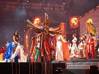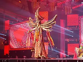 Gresya brought a national costume with the Torajan Tongkonan-inspired ensemble,[18][19][20] Tongkonan is the traditional ancestral house, or Rumah adat of the Torajan people, in South Sulawesi, Indonesia. Tongkonan have a distinguishing boat-shaped and oversized saddleback roof.[21][22] The costume named "Mystical Toraja" designed by Jember Fashion Carnival.[18][19][20] Asha Bhat of India crowned Stephania Stegman of Paraguay as the new titleholder at the end of the event.[43]