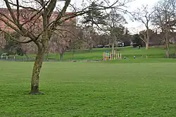 Provision for younger visitors is concentrated near the central path. A fenced playground equipped with modern climbing frames and swings sits alongside a lawn marked for sports. Immediately north is a covered youth shelter, installed in 2005 with funding from the Rotary Club of Bristol South, which functions as an informal meeting point and vantage over the main lawns.[3]