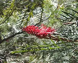 Grevillea 'Red Hooks' is a grevillea cultivar from Australia.[2] It is a shrub that grows to 3 metres in height and 4 to 5 metres in width and has pinnate leaves with narrow-linear lobes.[2] The inflorescences comprise greyish-green perianths and red styles which bend backwards. After being grown for many years under the misnomers Grevillea hookeriana or Grevillea hookerana, the cultivar was registered in 1987 under the name 'Red Hooks'.[2] It is thought to be a hybrid of G. longifolia x G. tetragonoloba.[2]