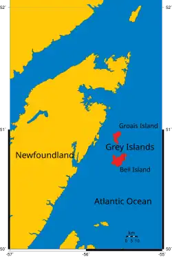 The Canadian Grey Islands consist of two islands, Bell Island and Groais Island, located off Newfoundland's Great Northern Peninsula to the east in the Atlantic Ocean.