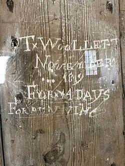 It is believed that one room of the guesthouse building, now Greyfriars Chapel, was used as a temporary prison cell in the late eighteenth century for inmates due for transportation. To this day, the names of inmates and dates of incarceration are carved into the wooden walls of the cell, including ‘T Woollett, November 1819, for 14 days for running’.