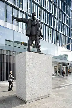At first glance the installation would appear to be a simple bronze statue, dressed in a neck scarf and loose fitting suit. However, the six-metre-high (20 ft) monument seeks inspiration from passers-by, inviting them to strike poses which he copies, continually changing his form in a light-hearted and mischievous way. The unique sculpture offers an alternative and accessible creative experience for the public, allowing them to create a dialogue with the work of art.