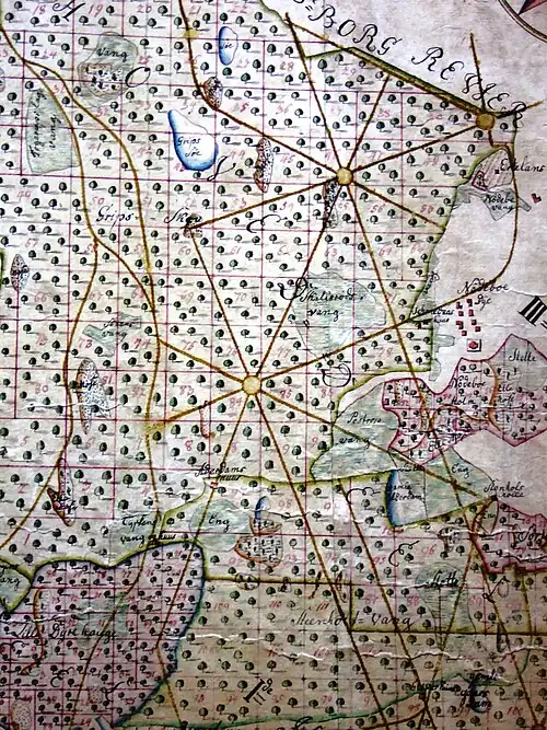The most prominent landmark is perhaps Svenskegrøften (lit.: The Swedish Ditch) initiated in 1576. It is a 2–3 km long artificial canal, winding its way through the forest from the lake of Store Gribsø and south towards the settlement of Gadevang in the southeastern section. As the name implies, Swedish prisoners of war were used for this large project, ordered by King Frederik II. The ditch is just one part of a larger network of ditches dug since the middle ages, to supply the Frederiksborg Palace with running water, to exploit the water resource for watermills in earlier times and to drain the wetlands so the land could be used for plantations. There are an estimated 526 km of artificial ditches in Gribskov.[12]