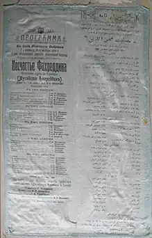 ![]() The tragedy's program on silk with the participation of Huseyn Arablinski. Azerbaijan State Theatre Museum in Baku | |