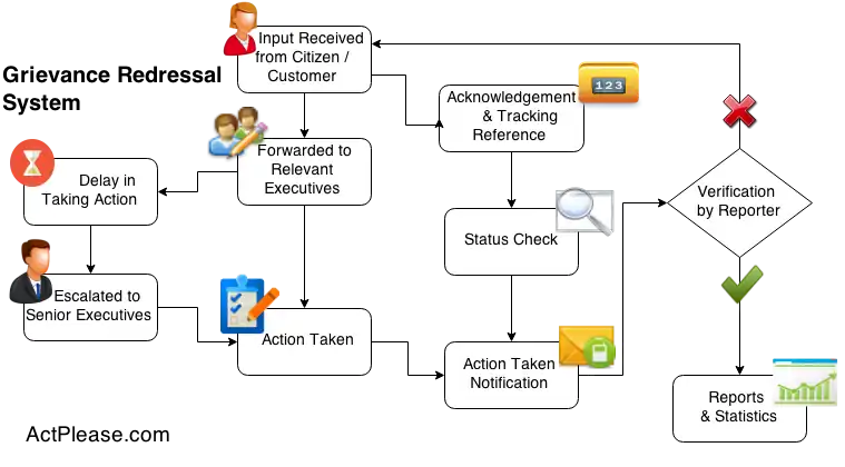 Organizations define their own process flows for grievance redressal. These are rarely made known to the public in case of private businesses; governments and non-profits usually share voluntarily or by mandate the hierarchy of officers responsible for taking corrective action. Some organizations maintain a custom-developed ticketing software, while others count on SaaS Portals such as ActPlease.com. Feedback Portals such as TripAdvisor and Yelp are driven by consumers, and organizations / businesses have the option to join and participate. Depending on the desire to correct as well as level of transparency of the organization, grievance redressal flow can include the following steps: