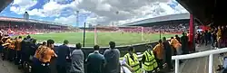 - Braemar Road Stand – A two-tiered all-seated stand located along the Braemar Road,[49] with the lower tier being known as 'the Paddock'.[50] The stand also housed the dressing rooms, supporters' bar and club offices.[51] The stand's forecourt housed the club shop and ticket office.[52] Until 2010, the dugouts were located in front of the stand.[53]
