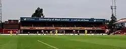 - Ealing Road Terrace – A single-tier terrace located at the Ealing Road end of the ground.[49] Previously uncovered, the club had an application to build a roof turned down in 2004 and the terrace finally received a roof in 2007.[13][59] Traditionally a home end, the terrace housed away supporters at various times throughout the 2000s.[60]