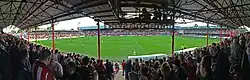 - New Road Stand – A single-tiered all-seated stand located along the New Road.[49] During its final years it was officially named the Bill Axbey Stand, as a tribute to the club's oldest-ever supporter.[54] The away supporters' section was housed in the northwest corner of the stand until October 1991.[55] Previously a terrace, the stand was converted to seating during the 1996 off-season.[1] In 2010, at the request of then-manager Andy Scott, the dugouts were relocated in front of the stand.[56][57] The central camera position for TV broadcasts of games was located in a gantry suspended from the roof of the stand.[58] The Family Section was located in blocks N506, N507 and N508.[26]