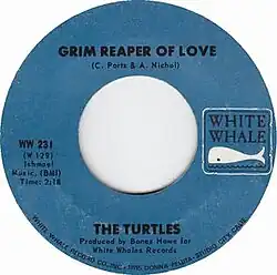 "Grim Reaper of Love" is a single by the American rock band the Turtles, written by their lead guitarist Al Nichol and bassist Chuck Portz. The song was conceived by the band members after dismay that their previous US Billboard Hot 100 entries had been composed by outside singer-songwriters. It was written at night following one of the band's gigs in Oregon and finished by the following morning. Producer Bones Howe recorded the song together with the Turtles at Western Recorders in Hollywood, Los Angeles during sporadic sessions in April 1966. It is a psychedelic raga rock song owing to the band's newfound will to experiment. The use of drummer Don Murray's quintuple meter (5