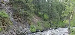 Grimes Creek was named for George Grimes, a prospector in 1862.[2] George Grimes was killed by Indians near the stream's course.[3]