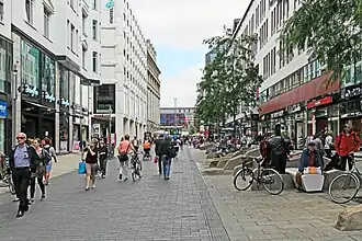 Grimmaische Strasse is a street in Leipzig, borough Leipzig-Mitte, and connects the marketplace with Augustusplatz. It was named in 1839 after the Grimma Gate (Grimmaisches Tor), the gateway to Grimma, which was first mentioned in 1421.[1][2] Before that it was called Grimmaische Gasse and was the main street of the Grimma quarter (German: Grimmaisches Viertel).[3] Today it is a heavily frequented pedestrian zone in a prime location with department stores, shops, restaurants, hotels, a museum and the university as residents.[4]