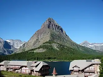 ![]() Grinnell Point rises above Swiftcurrent Lake and the Many Glacier Hotel | |
