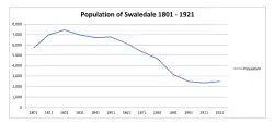The lead mining industry in Grinton, and Swaledale, had a profound effect on the population of the dale. The graph shows the census statistics for 120 years across the 19th and early 20th century. A depression in the lead industry between 1829 and 1833, led to fall in the number of miners, but the lead industry was dwindling by this time anyway due to cheaper imports from abroad. Thereafter, the statistics are steadily dropping.[28]