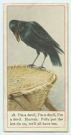 She was a talking bird and knew several phrases, her favourite being "halloa old girl". She may have also used some of the phrases that were used by the character Grip in Dickens's Barnaby Rudge, including "Polly, put the kettle on, we'll all have tea"; "keep up your spirits", and "Bow, wow, wow".[7]