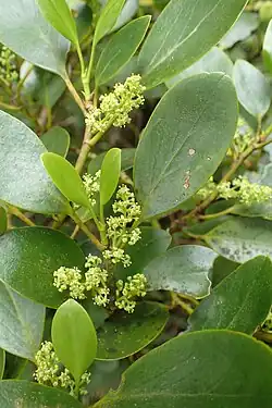 The flowering time of Griselinia littoralis is in spring when small greenish yellow flowers appear.[12] The flowers are borne on 2–5 cm (1–2 in) long panicles, each panicle with 50-100 individual flowers, each flower 3–4 mm across, with five sepals and stamens but no petals. Following flowering, small blackish berries are formed, as long as male and female Griselinia littoralis are located in the same area so pollination can occur.[12] Birds are a vector in spreading the seeds around the area, minimizing competition within the same species for water, sunlight and nutrients. Also allowing the Griselinia littoralis to establish in new areas. Germination of the seeds occur when the seeds drop to the ground and reproduction occurs.[12] This plant has a long life span generally over fifty years.