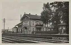 Grorud Station is situated 10.50 kilometers (6.52 mi) from Oslo Central Station, at an elevation of 127 meters (417 ft) above mean sea level.[4] The wooden station building was built in Swiss chalet style, without any contemporary railway buildings in a similar design. The station building is no longer in use, but has been listed as a cultural heritage.[11]