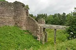 Grosmont Castle overlooks the village of the same name, and in its current form dates mostly from the work carried out by Hubert de Burgh with later 14th-century additions. It originally comprised an inner and an outer ward, but the latter has been encroached upon by local gardens.[6] The outer ward would have held a rectangular storehouse or stable.[6] The inner ward forms a stone castle with a gatehouse, two circular mural towers, a hall and a north accommodation block, the whole being protected by a ditch.[6] Originally other timber buildings would have been raised against the outer stone wall as accommodation for the castle's servants, but only limited traces of these survive.[26]