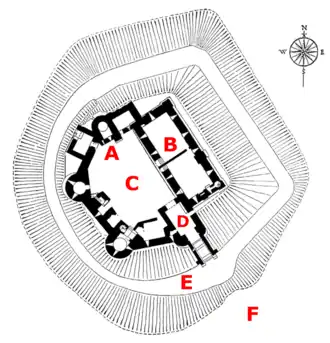 The gatehouse was originally a two-storey, rectangular tower with 14th-century additions, including a buttressed drawbridge pit, but only limited parts of it now survive.[27] The south-west tower was converted into a three-storey suite of rooms in the 14th century; its basement was filled in.[28] The three-storey west tower was also altered during the 14th century, and the basement filled in.[29] The north block is primarily a 14th-century addition to the castle, built over the remains of one of the circular towers and the old postern gate.[30] It comprises three distinct buildings, the largest being a three-storey residential tower. The block has a distinctive octagonal chimney with a carved top.[31]