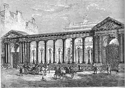 Another extension was added in 1842, in the form of a 110-foot (34 m) long classical-style colonnaded entrance screen on Upper Grosvenor Street. At each end was a triumphal arch with pediments above sculpted with the Grosvenor arms. Thomas Cundy, the architect of this vast house, then proposed a larger mansion to go all the way along to Park Street, extending all the way to 230 feet (70 m). This idea was dropped, as the 2nd Marquess thought it would be too lavish.