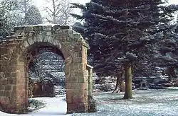 In the park are three medieval arches moved from elsewhere in the city, both of which are listed at Grade II. St Mary's Arch with its wing walls dates from around the 13th century and formerly stood in St Mary's Benedictine Nunnery.[11][16] The Old Shipgate Arch formerly stood to the west of the Bridgegate and was taken down in 1831.[11][17] The third archway was removed from St Michael's Church.[18][19] Also in the park and listed at Grade II is Jacob's Well Drinking Fountain consisting of a small stone arch with a drinking fountain for people and a dish for their pets, which is now dry.[11][20] During the laying out of the park a long line of Roman earthenware water pipes was discovered close to the lodge which used to bring fresh water from Boughton to the Roman fortress. In the 1950s a rockery was constructed on the southern edge of the park with waterfalls, streams and fountains.[11] The main gates of the park, together with other gate piers and sections of the park walls, all designed by John Douglas, are listed at Grade II.[21][22][23][24]