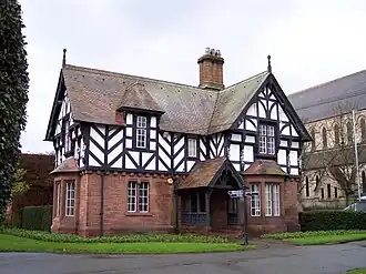 Designed by local architect John Douglas, this was originally the park keeper's lodge. The building has been designated by Historic England as a Grade II listed building.[8] For a time it housed the city council's parks & gardens office. After the 2014 refurbishment of the park, it reopened as The Lodge Cafe.[9] The lodge, together with some of the other structures in the park, are among Douglas's first recorded commissions by the Grosvenor family, and the first known example of his use of black-and-white architecture.[10][11] The lodge is in two storeys, the lower storey being built in red sandstone and the upper storey being timber-framed with plaster panels. The roofs are of red-brown tiles.[8] On the upper storey are eight carvings which represent William the Conqueror and the seven Norman Earls of Chester.[12]