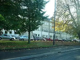 Grosvenor House is at the end of a terrace of 42 houses (the other houses are numbered 1 to 41), with double curves to the large central house, number 23, which was formerly the Grosvenor Hotel until the 1970s and has large Ionic half columns on the 1st and 2nd floors.[1] Number 23 then became affordable The Guinness Partnership flats.[3] In 2020 ownership returned to Bath and North East Somerset Council, who will convert it to supported accommodation for former rough sleepers.[4]