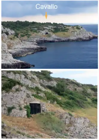 The Grotta del Cavallo or Cavallo Cave (Italian:"Cave of the Horse") is a limestone cave in the region of Apulia, Southern Italy, near Nardò 90 km (55.92 mi) south of Taranto. The cave is about 15 m (49 ft) above present sea level. It has a rounded entrance, 5 m (16.40 ft) wide and 2.5 m (8.20 ft) high opening toward the sea. The cave was rediscovered in 1960 and two waves of excavations ensued. The first wave spanning from 1963 to 1966 and the second from 1986 to 2008. The cave was disturbed by looters during the period between the two waves of excavations, damaging the layers corresponding to the Upper Palaeolithic; because of this, the cave entrance is covered by a gate and is closed to the public.[1]