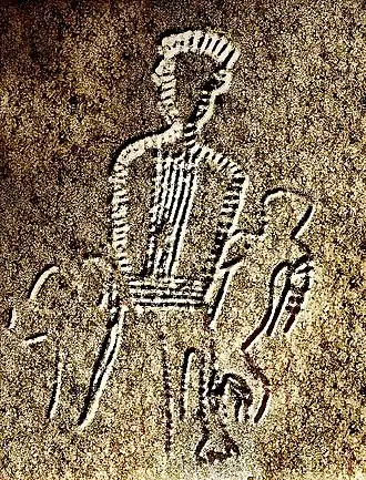The main figure, which dominates over the animals, is that of a man wearing what appears to be a stitched jacket. He dons a headdress of a particular elongated and convex shape. Bracelets can be seen on his arms. Beside him are two other figures, one with a bird head or mask, possibly in a dancing position, and the other in motion, with a hairstyle similar to the central figure. It is not yet known whether this depicts a ritual dance or a prayer before the hunt.