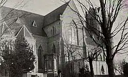 Rev. Edward Sorin, C.S.C., the French Holy Cross priest who founded the University of Notre Dame, had a lifelong devotion to the Blessed Virgin Mary and named several institutions he created after her.[1]: 2 [2]: 144 In 1842, he founded the university in the midst of what was then wilderness in northern Indiana at a former Jesuit mission site that was then-named Sainte-Marie-des-Lacs (lit. "Saint Mary of the Lakes"), giving the site the French name of Notre Dame du Lac (lit. "Our Lady of the Lake") after the Mother of God.[1]: 3 He and several Holy Cross Brothers, with whom he had traveled to the New World, began to construct a chapel by Saint Mary's Lake, which they completed in 1844. On December 8, 1844, Sorin dedicated the newly built chapel to Our Lady of the Lake, naming the building the "Chapel of the Most Holy and Immaculate Heart of Mary".[1]: 4–5 Several years later, in 1855, he granted the Sisters of the Holy Cross a parcel of land along the St. Joseph River, where they would build the Academy of St. Mary's of the Immaculate Conception—an educational institution that would later become Saint Mary's College.[1]: 5–7 Sorin would also see through the construction of the Church of the Sacred Heart, named after Our Lady of the Sacred Heart.[1]: 9, 11