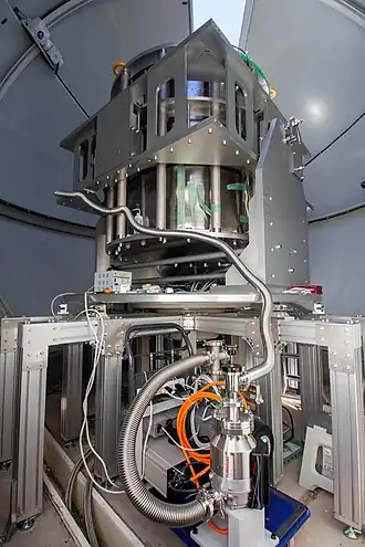 The experiment uses microwave kinetic inductance detectors (MKIDs),[4] which are cooled to 250mK by a sorption cooler within the cryostat, which uses helium-3, and was manufactured by Chase Research Cryogenics Ltd.[2] The signals from the detector are multiplexed, and around 100 detectors can be measured in both phase and amplitude with a single digital read-out system with a bandwidth of 200MHz, recording 1,000 samples per second. The digital system uses 12-bit ADCs and a Kintex-7 FPGA from Xilinx initially,[4] and now uses Kintex ultrascale FPGAs. Raspberry Pis are used to monitor and control the telescope.[5]
