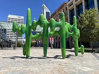 Grow Your Own is a public sculpture situated in Forest Place, located in the central business district of Perth, Western Australia. Created by artist James Angus and unveiled in 2011, the sculpture is notable for its large scale, bright green colour, and abstract form. It has become a prominent city landmark and is colloquially referred to as the Cactus due to its resemblance with a stylised plant. Other nicknames include the Antenna, with some suggesting it symbolises an antenna which has fallen off one of the surrounding buildings.