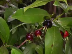Eugenia brasiliensis, with common names Brazil cherry[2] and grumichama,[2] is a medium-sized tree (maximum 20 meters height) endemic (native) to southern Brazil which bears small fruits that are purple to black in color, and have a sweet cherry to plum-like flavor.[3]